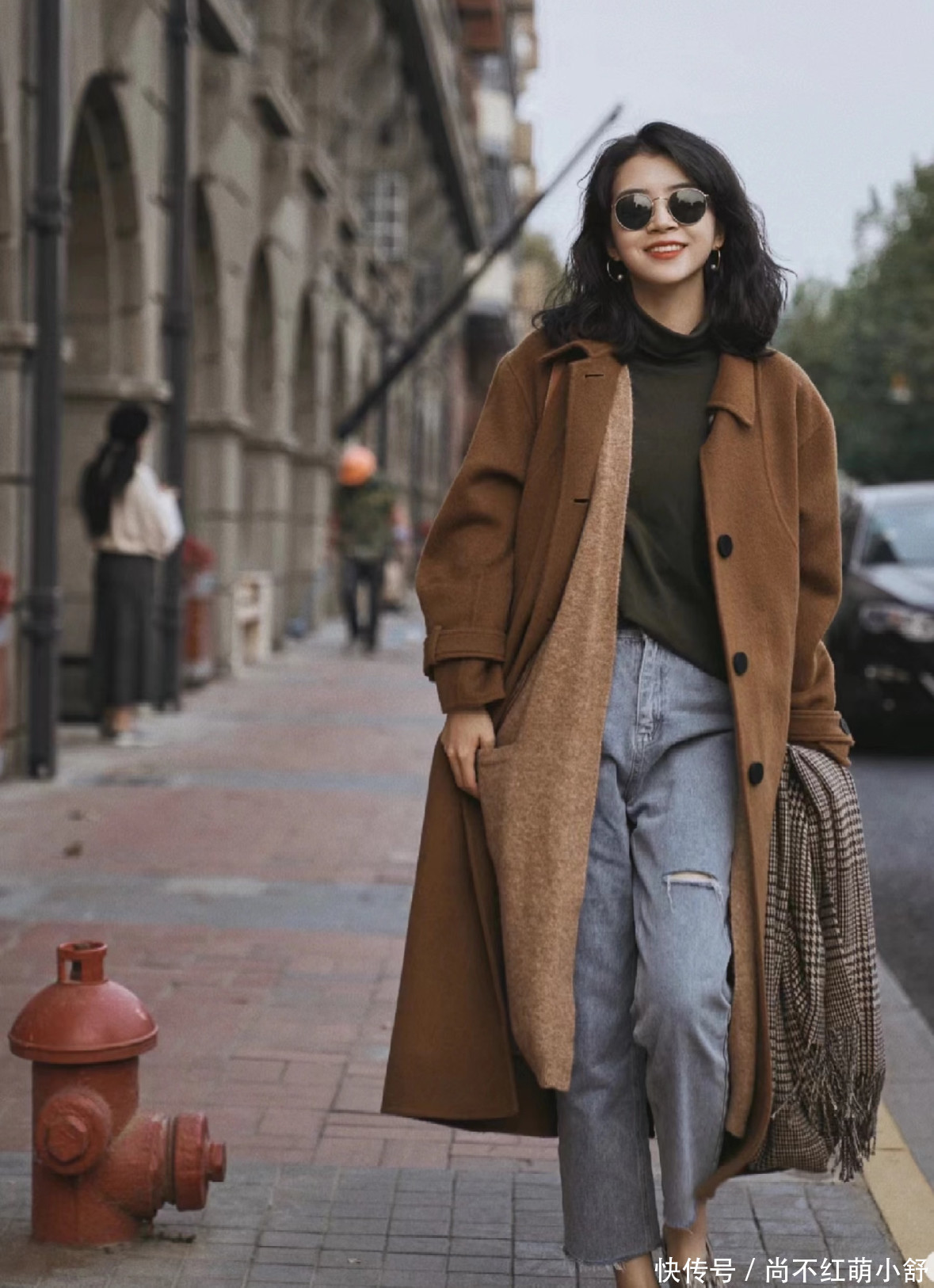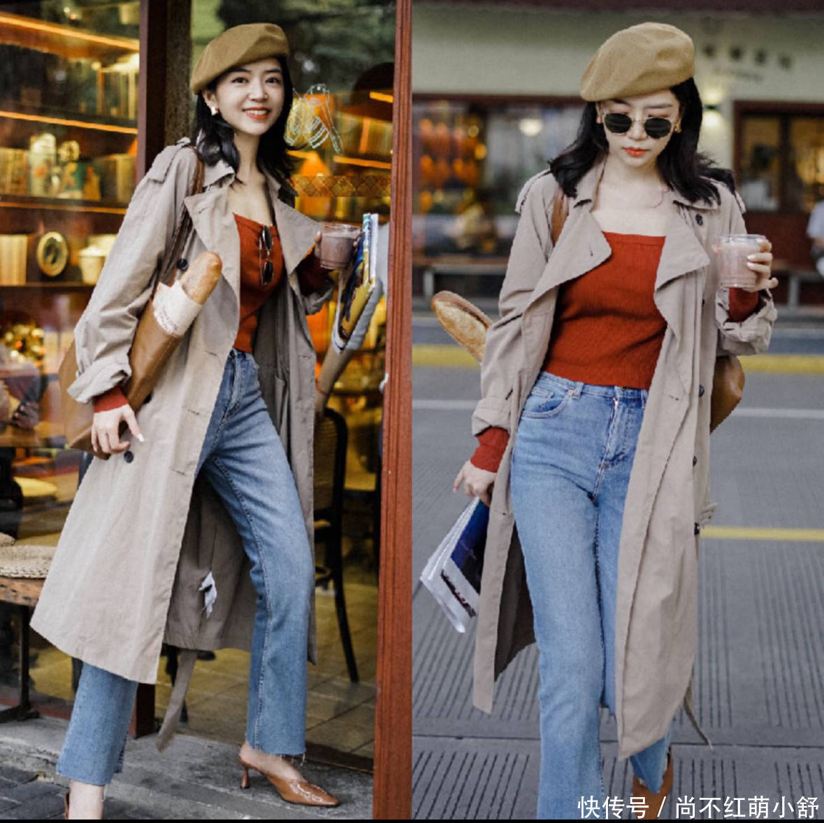 2. 温柔知性风:X型系带大衣 + 蓝色牛仔裤 + 黑色靴子,这不真是很多网友都在追的美拉德风典范吗,真是百搭又时髦。