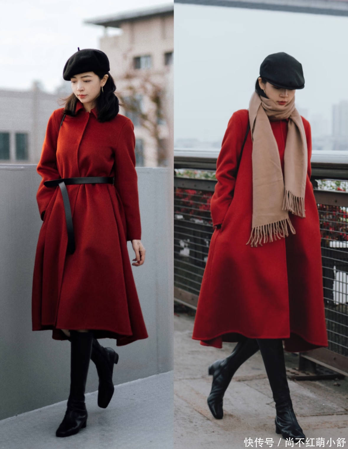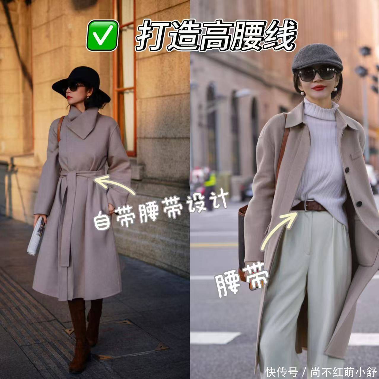 穿搭小知识点:当大衣是X型(系带款) 时,把腰带系得比实际腰线更高一些,并在前方系一个精致的结,侧面看会更显瘦。